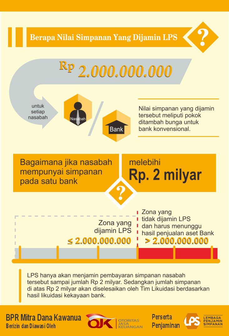 Para Nasabah tidak perlu khawatir karena simpanan Anda akan aman bersama kami. Karena simpanan / deposito anda akan dikelola oleh tim profesional, terdaftar dan diawasi oleh Otoritas Jasa Keuangan (OJK) serta dijamin Lembaga Penjamin Simpanan (LPS). Sehinga dana anda selalu terjamin bersama kami. Adapun fungsi dari LPS yaitu Menjamin simpanan nasabah penyimpan. Turut aktif dalam memelihara stabilitas sistem perbankan sesuai dengan kewenangannya. Dengan dijaminnya simpanan anda oleh LPS berarti jenis dan jumlah simpanan anda akan terjamin, pembayaran klaim akan terjamin.